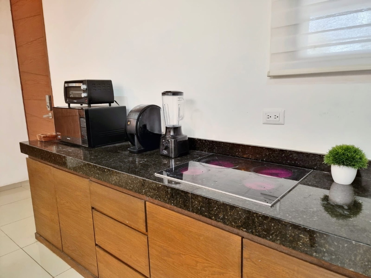 Construcción e Instalaciones especiales: 2 proveedores de Internet independientes para una conexión confiable de alta velocidad. Dormitorios con baño privado cada uno. Azotea con gimnasio y jacuzzi con increíbles vistas al atardecer todas las tardes. Cama king size en rec 1 y queen size en rec 2, sofa cama en sala.