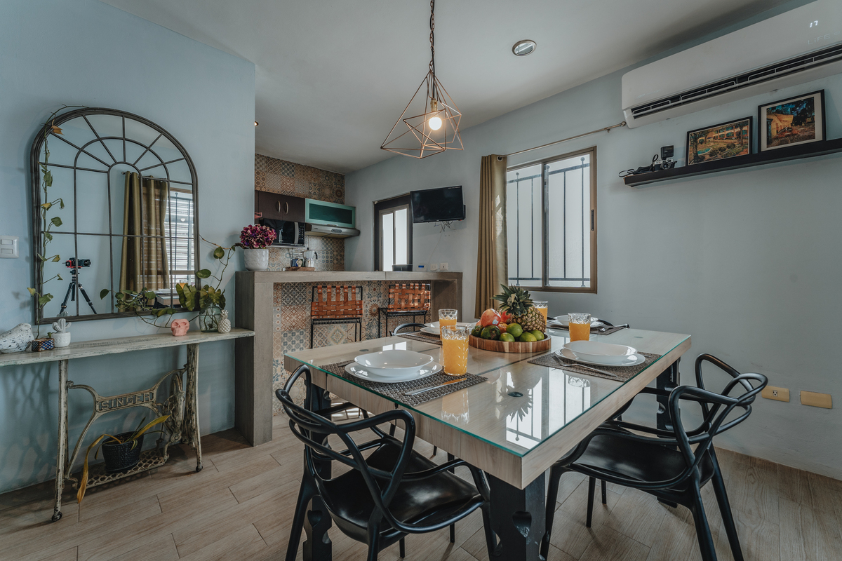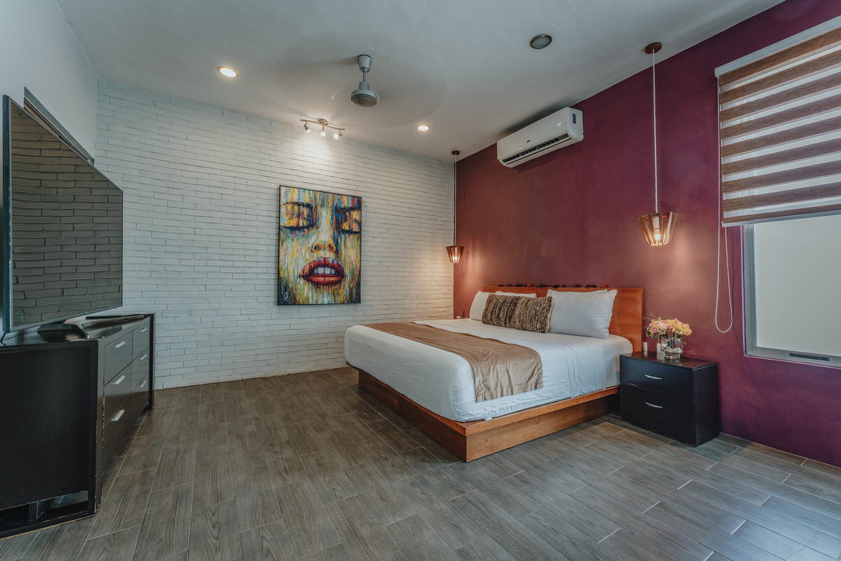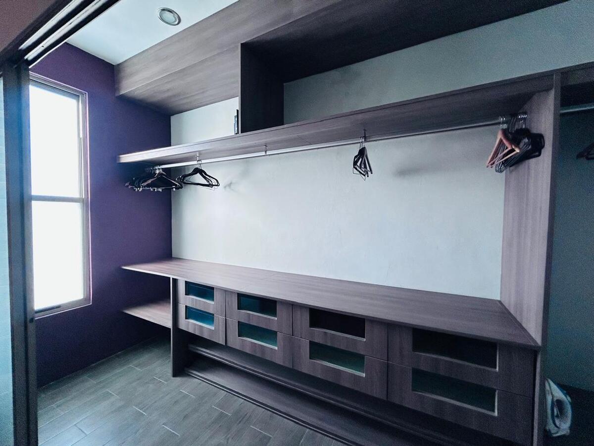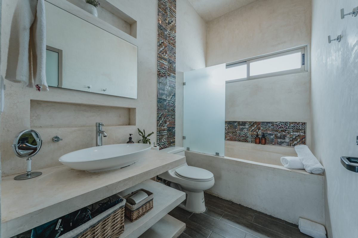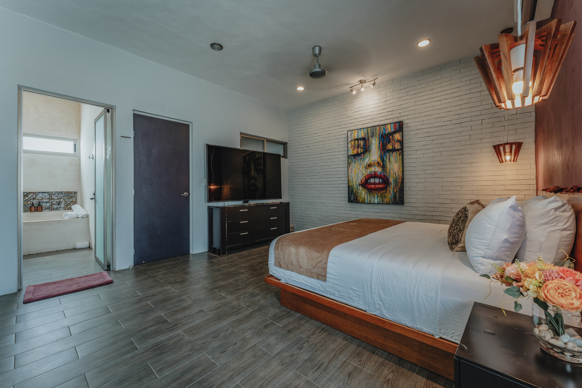 -Habitación principal con baño propio, jacuzzi con acabado de chukum, cancel de vidrio templado y clóset vestidor.