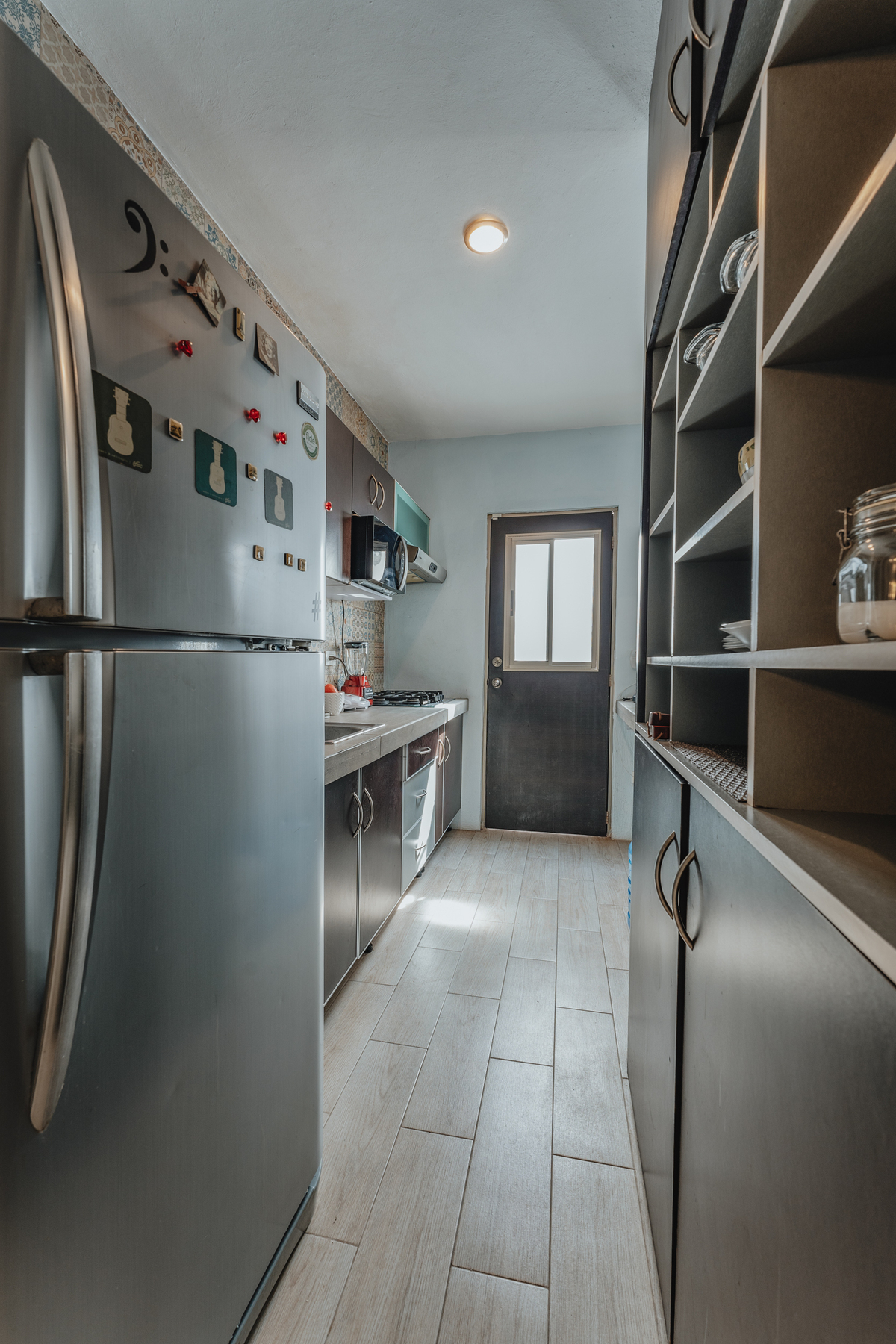 -Cocina con gabetas y parrilla de gas con 4 quemadores y puerta al pasillo de servicio.