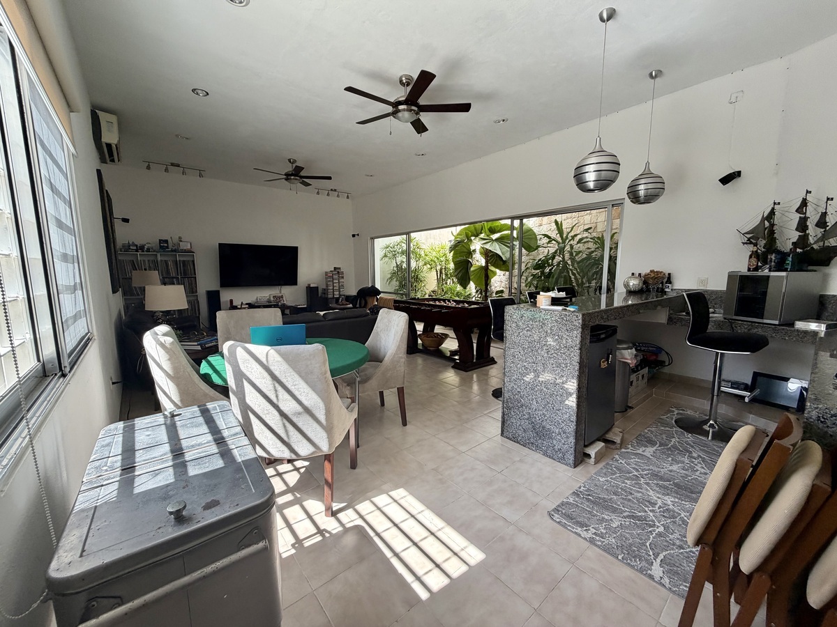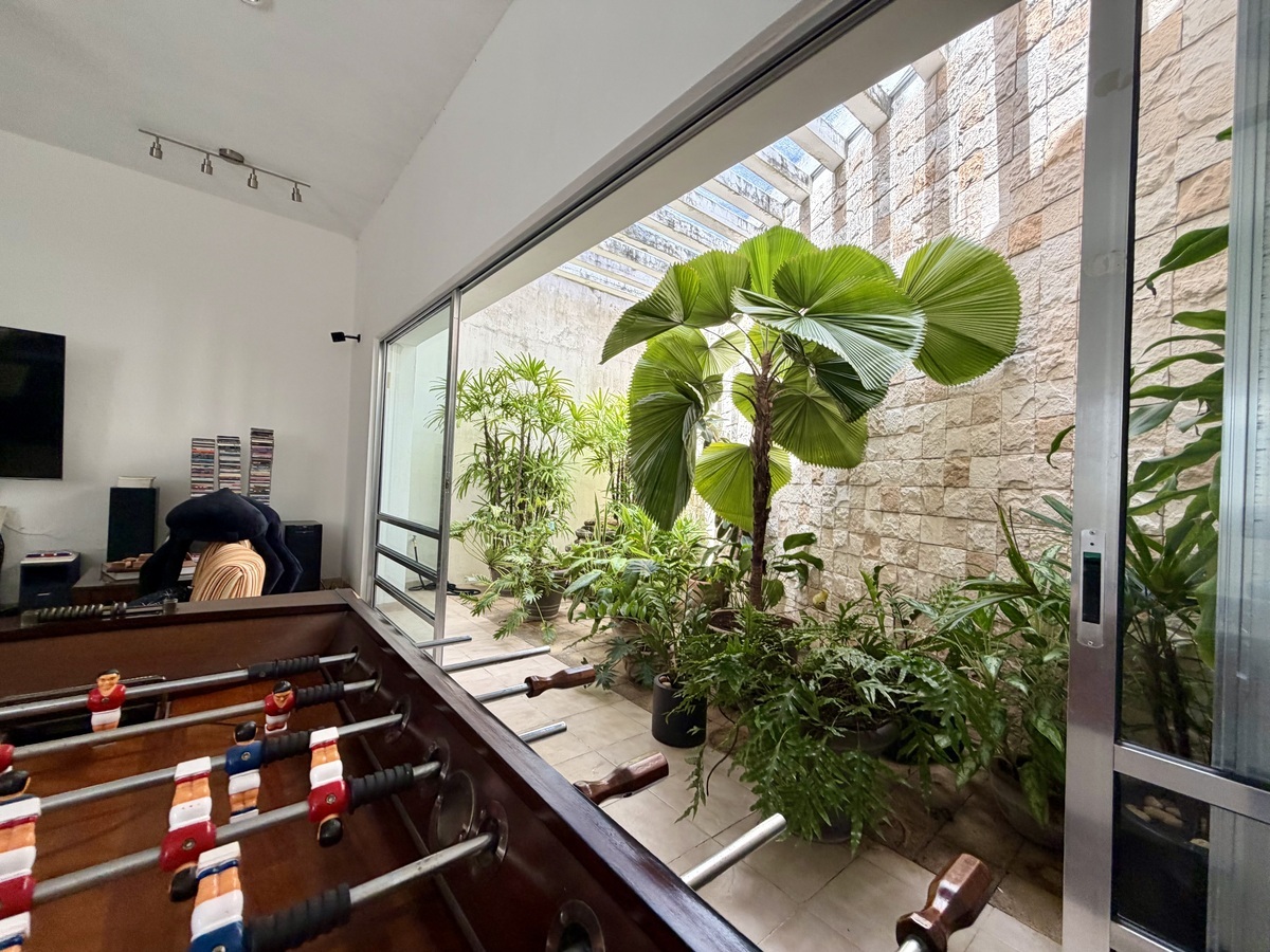 Sala con área social, barra y jardín interior.