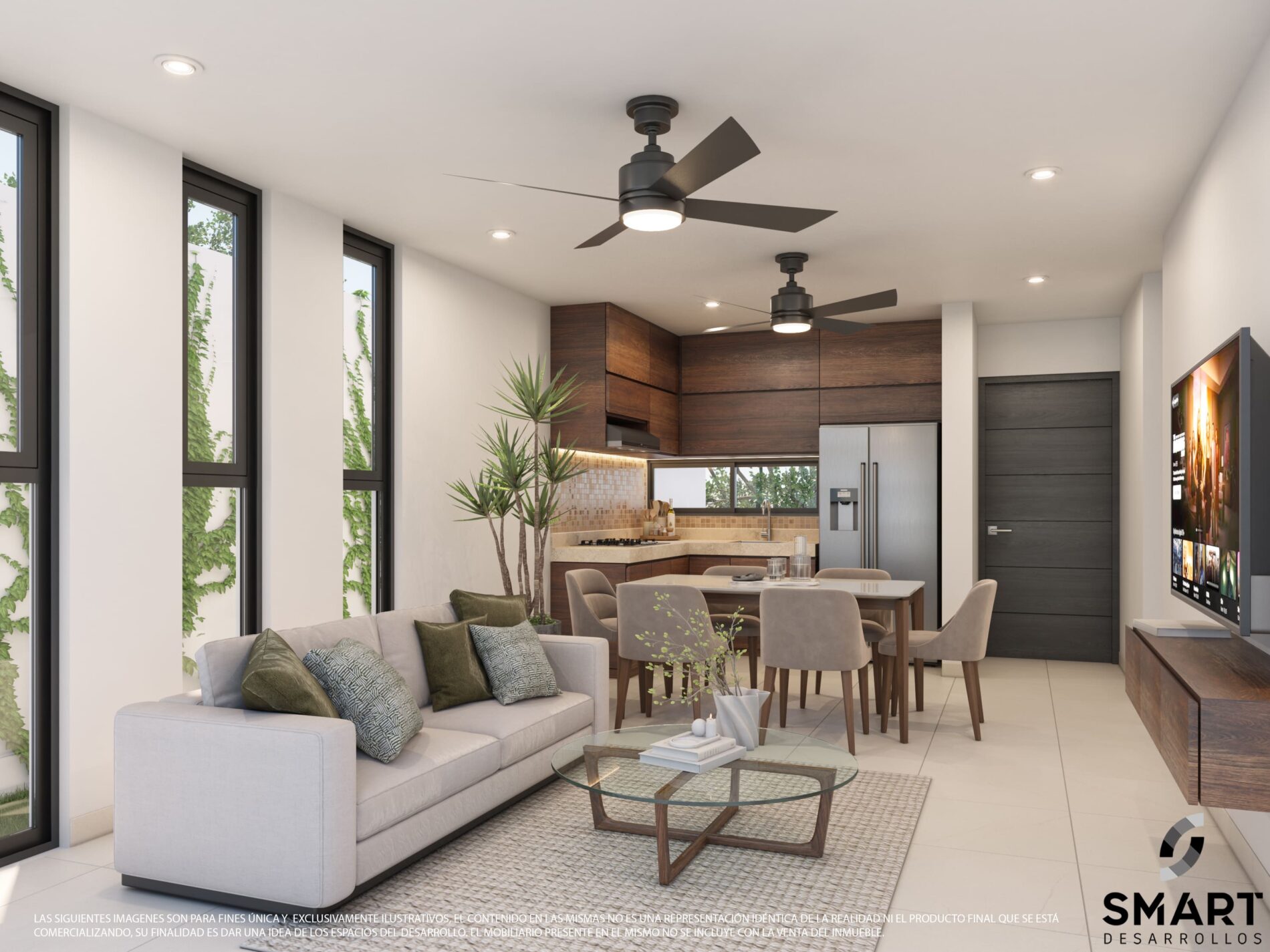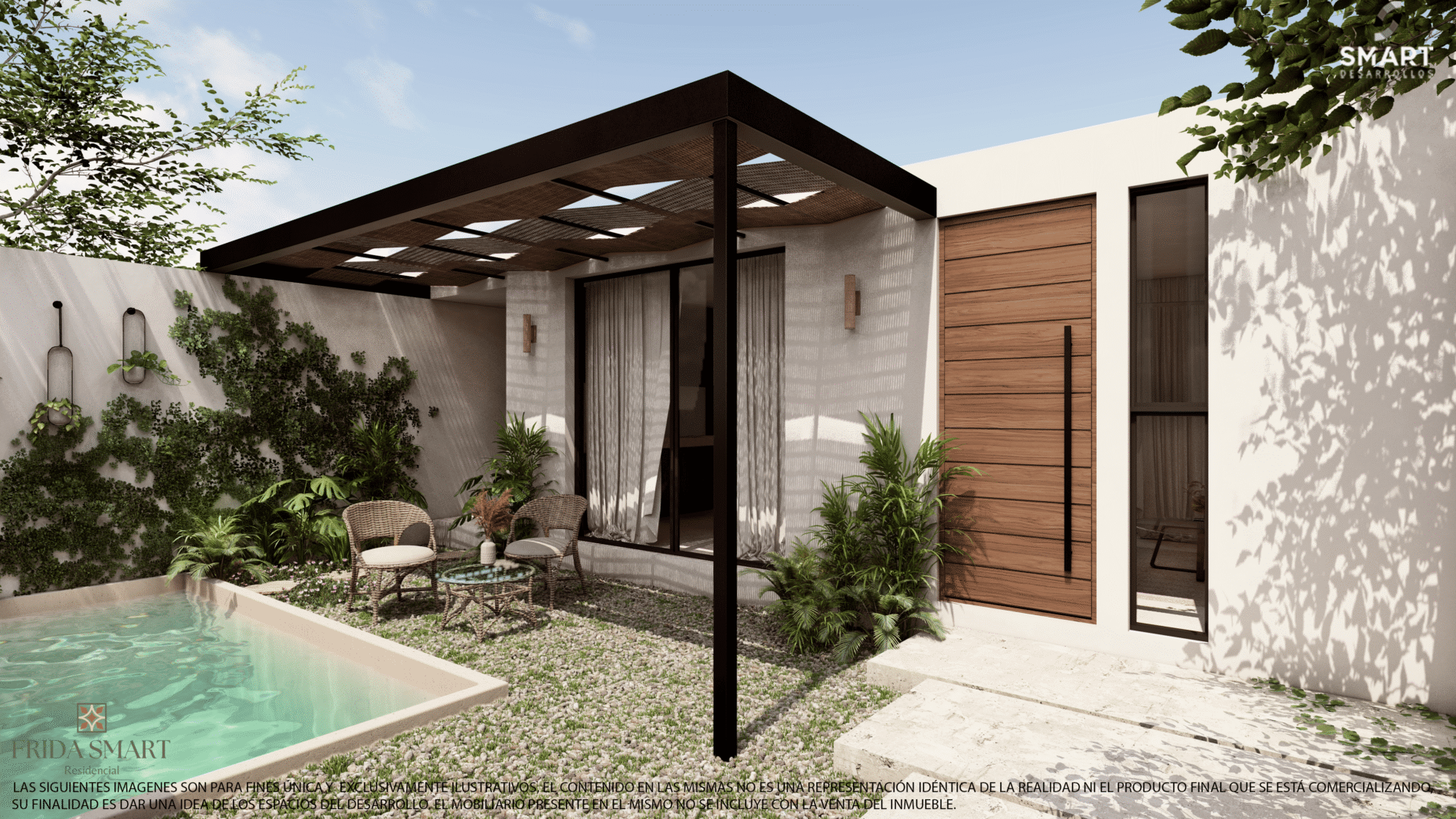 (lavabo, inodoro y regadera), 1 recámara con espacio para clóset. Cuenta con una superficie techada de 60.34 m2 y una superficie pergolada de 34.67 m2.