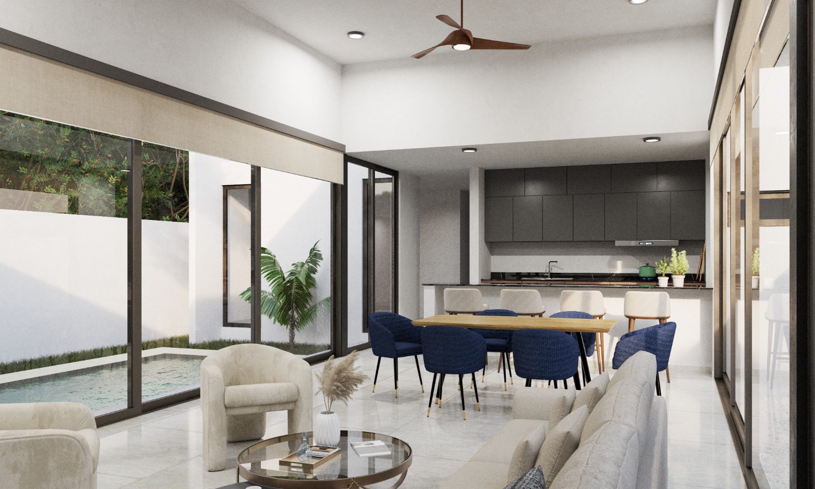 – Sala / Comedor corridos con techos a altura y media, vistas panorámica a ambos jardines laterales y salida a la terraza