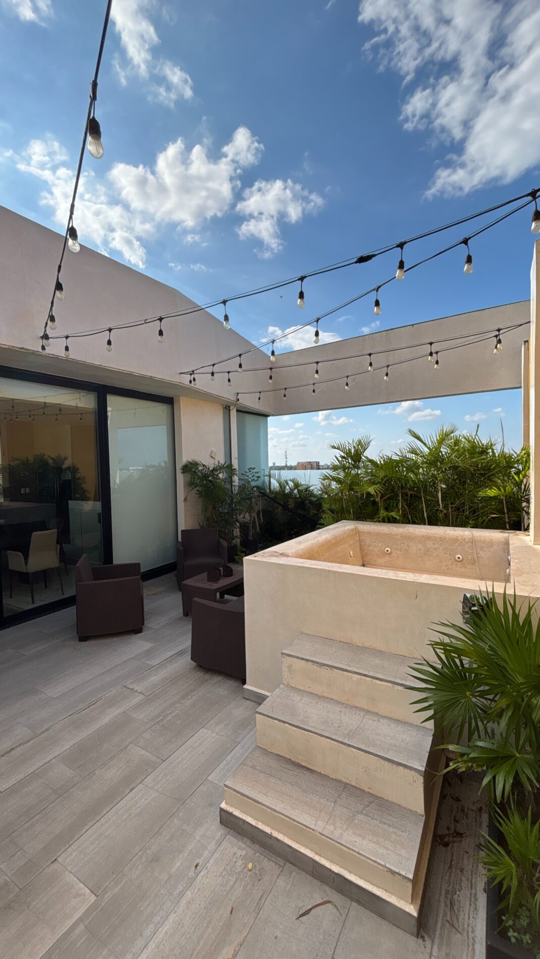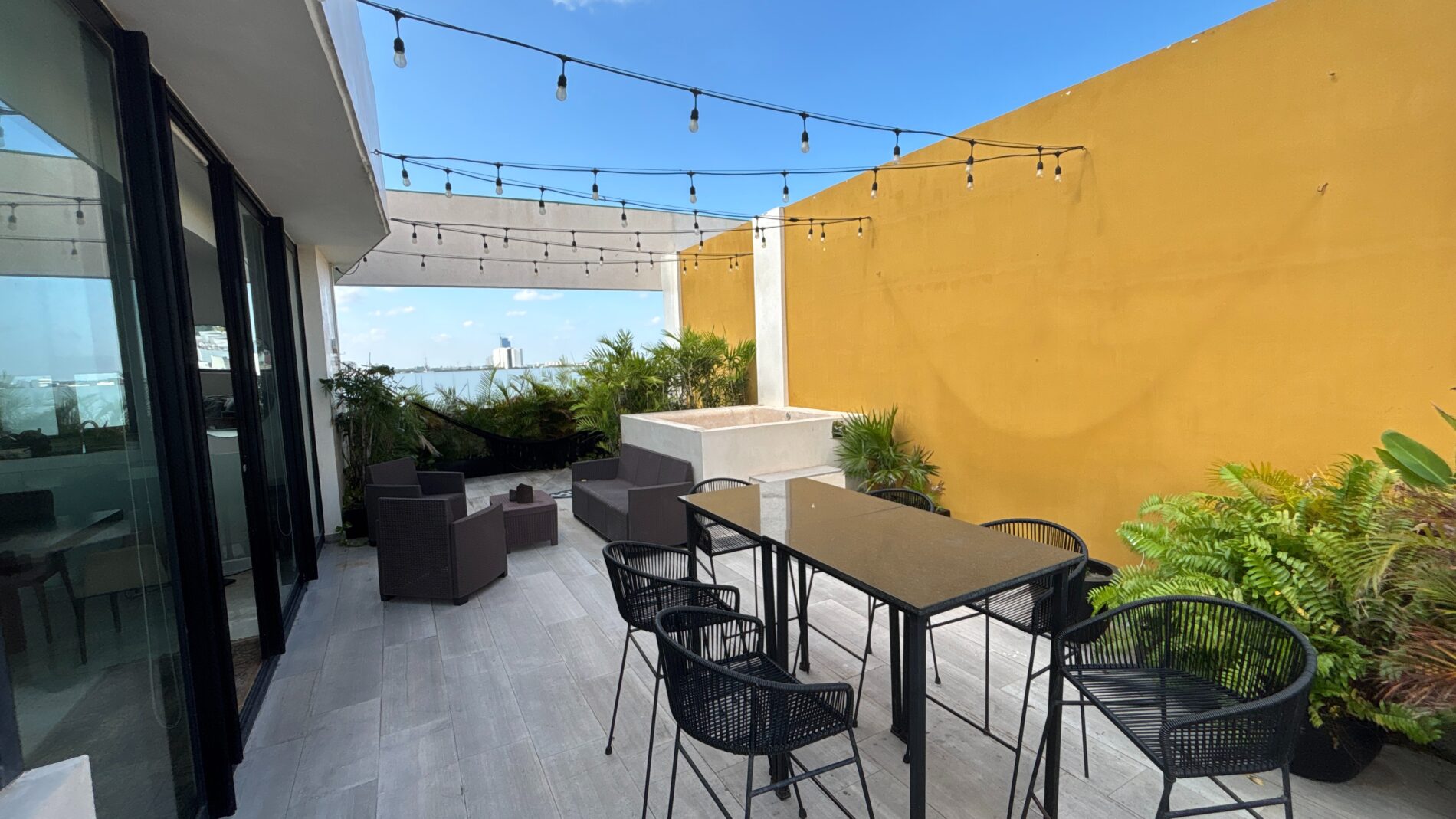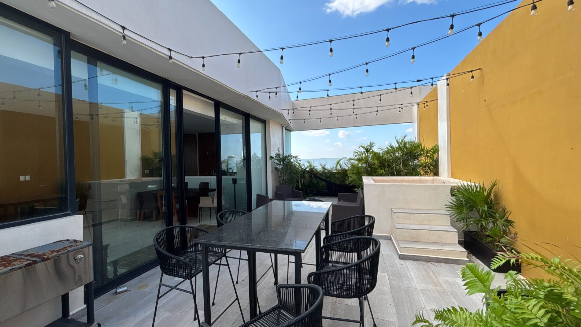 Amenidades del complejo: cancha de pádel y acceso controlado.